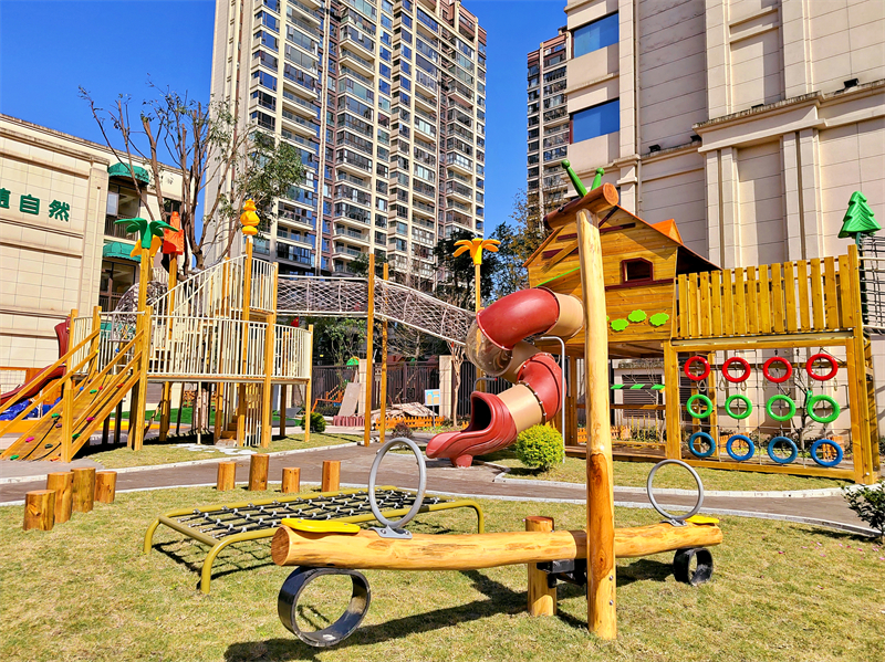 社區的休閑廣場上,大型戶外兒童游樂設備也扮演著重要的角色。放學后,孩子們紛紛來到這里,與小伙伴們一起玩耍。他們在組合滑梯上你追我趕,進行著快樂的競賽;在旋轉設施上感受著眩暈的刺激;在蹦床上盡情跳躍,釋放著充沛的精力。這里不僅是孩子們的游戲天堂,也是他們結交新朋友、培養社交能力的好地方。鄰居們也會在這里交流互動,增進彼此之間的感情,整個社區充滿了溫馨和諧的氛圍。